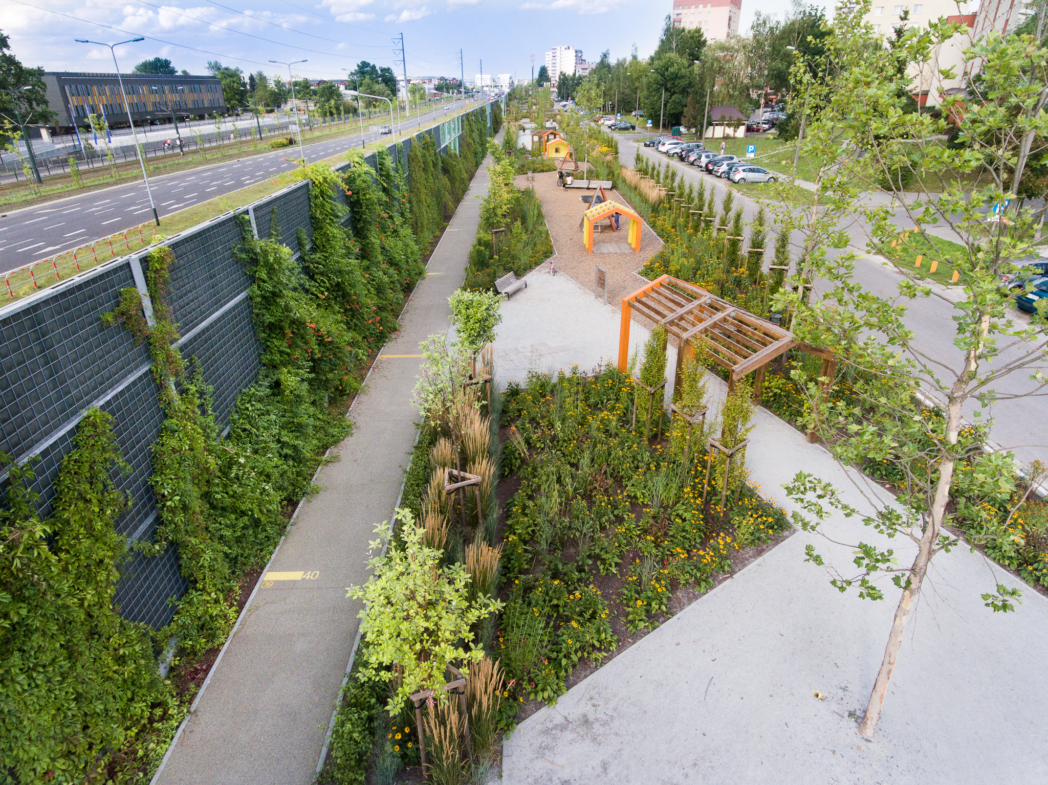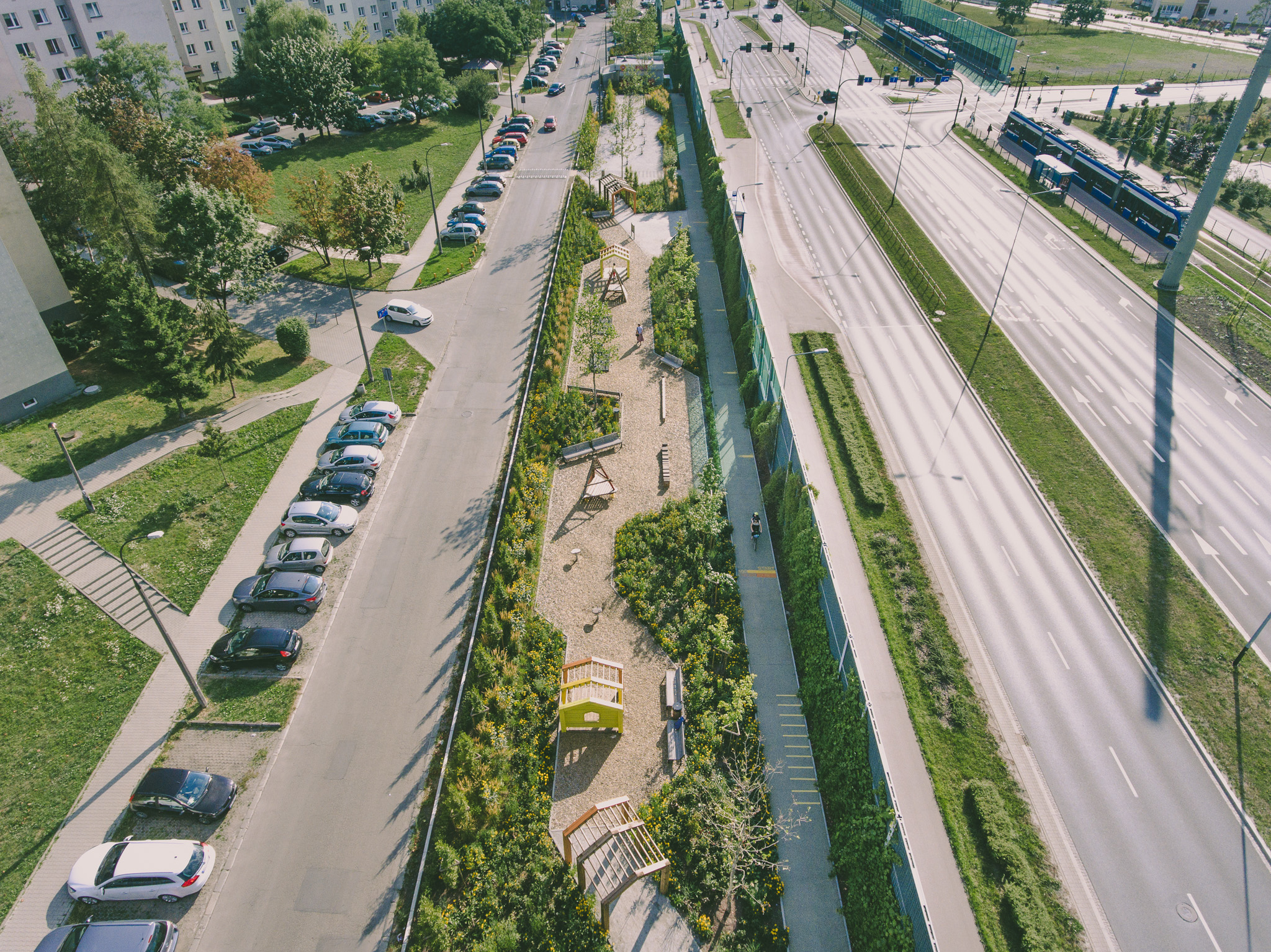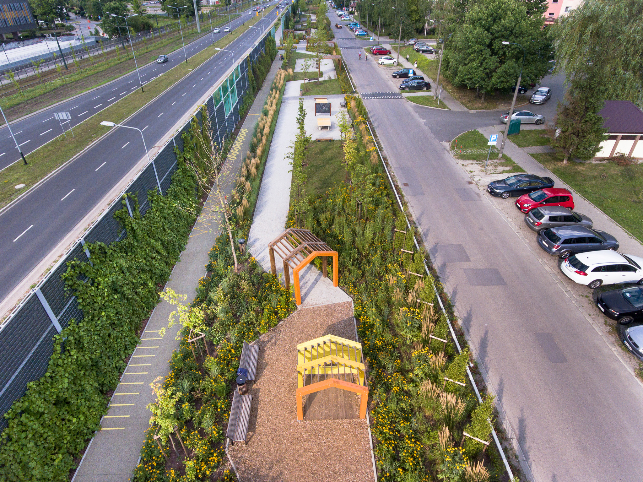 Mały park linearny wzdłuż ulicy Marii Dąbrowskiej oraz zagospodarowanie skweru przy rondzie Janiny Lewandowskiej.