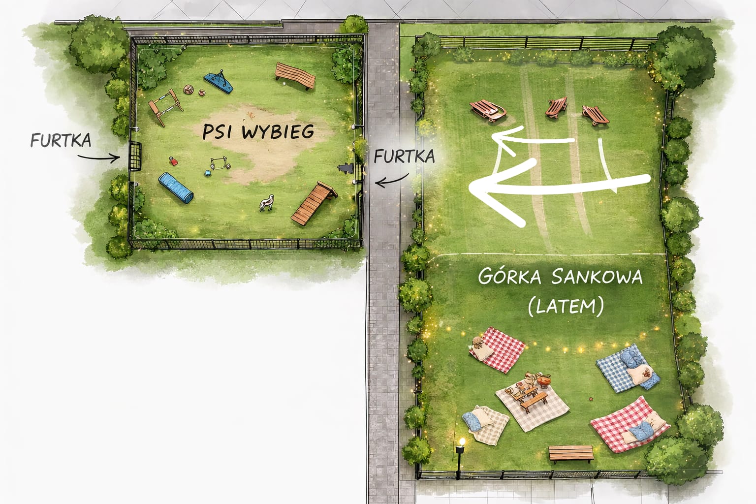 Projekt polega na wydzieleniu i oznaczeniu terenu działki rekreacyjnej 135/1 z przeznaczeniem na górkę sankową/piknikową oraz ogrodzeniu siatką działki 135/2 obr. 68 i przeznaczenie jej na swobodne zabawy z psem (bez kagańca i smyczy). Ogrodzoną przestrzeń należy wyposażyć w 2 furtki, ławki dla właścicieli, kosze na psie odchody i infrastrukturę do zabawy dla psów