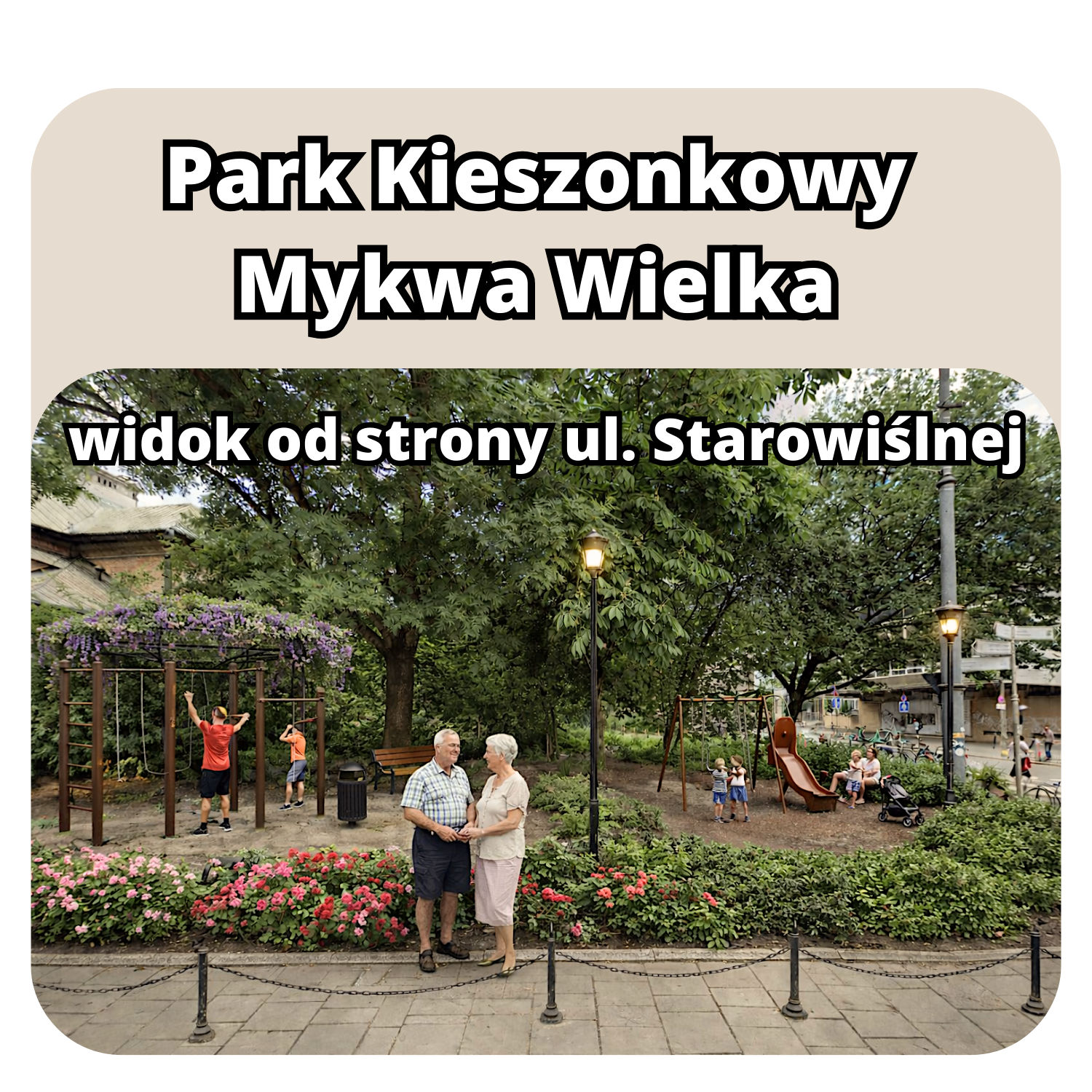 - Infrastruktura: 2 drewniane ławki, 2 kosze na śmieci, 1 stylowa latarnia LED typu retro (ciepłe światło 3000K, skierowane w dół)