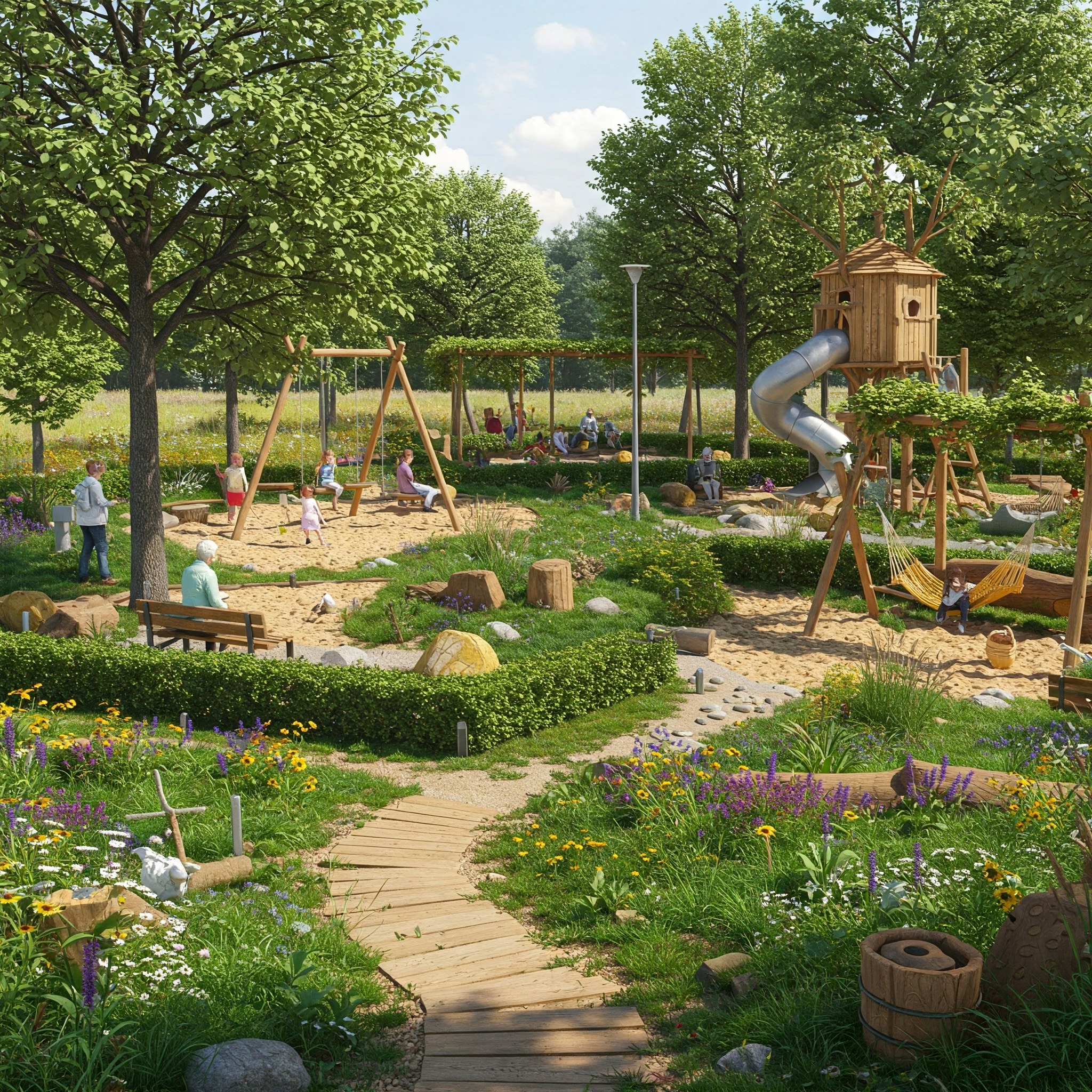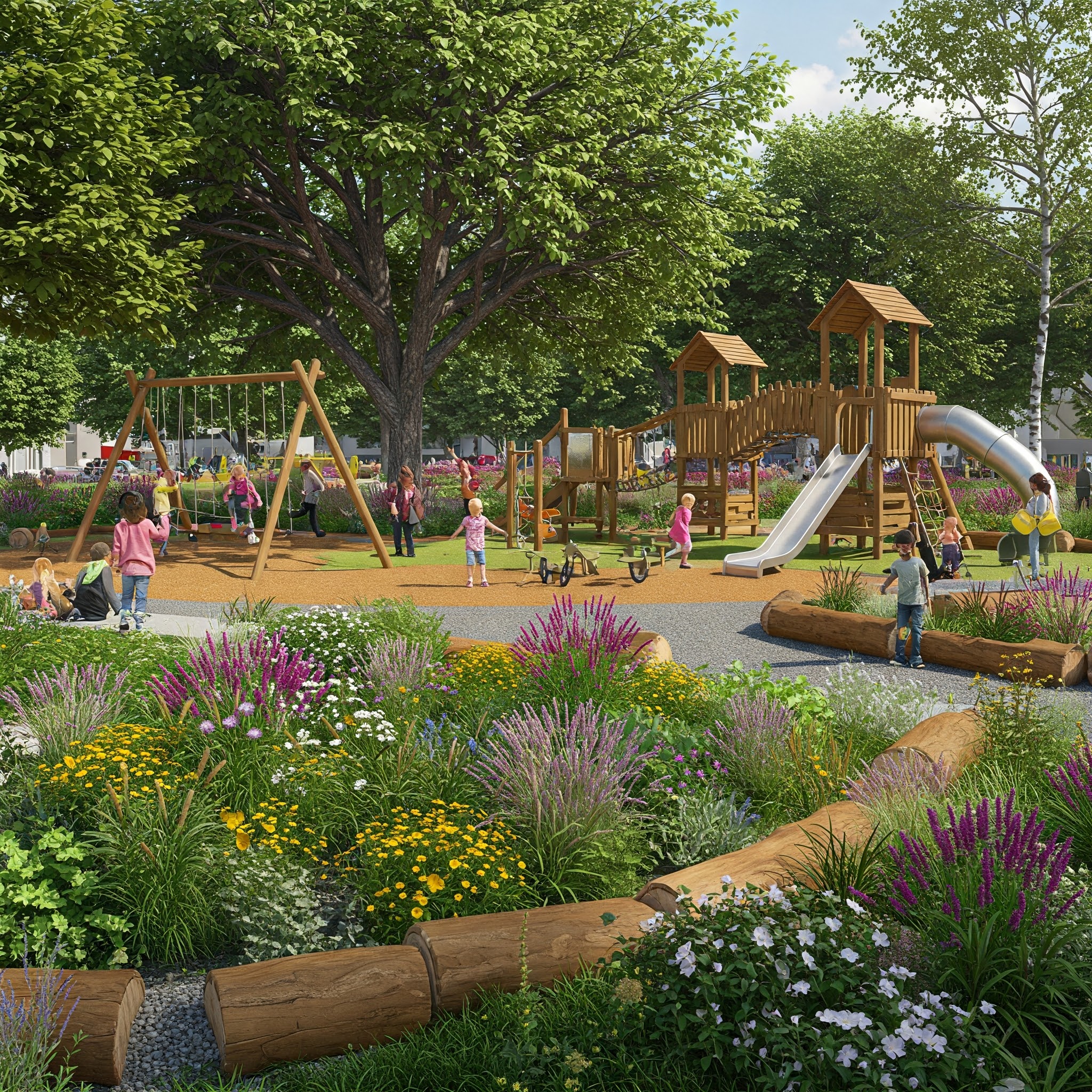 Plac zabaw zostanie wzbogacony o innowacyjne strefy rozwijające kreatywność, wyobraźnię i zmysły