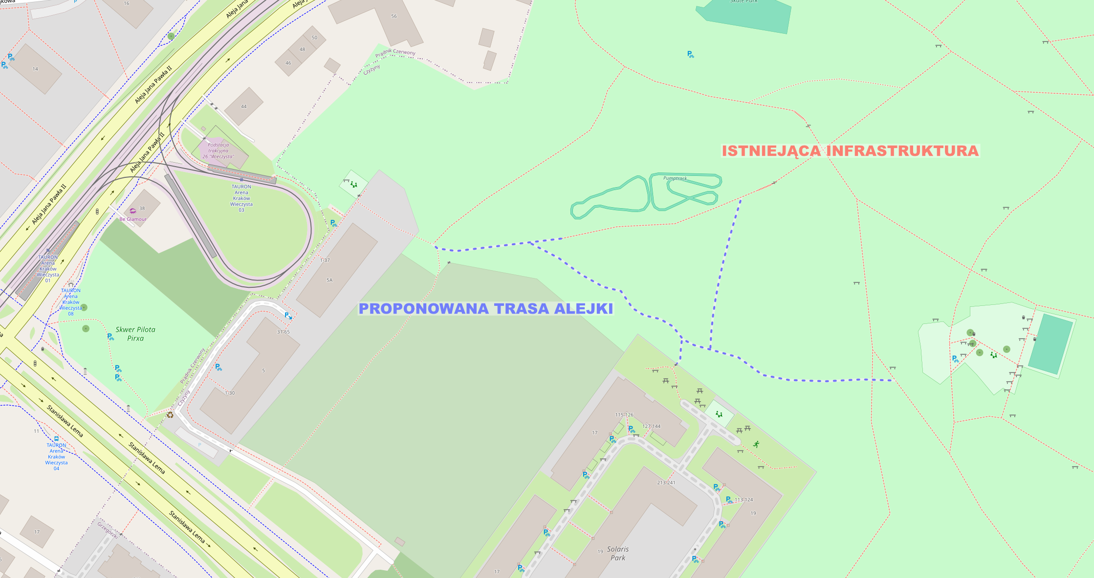 - Logiczne połączenia: Spięcie w spójną sieć dużego placu zabaw, skateparku, pumptracku oraz wyjść w stronę ul. Lema, al. Jana Pawła II i pętlę tramwajową TAURON Arena Kraków Wieczysta.
