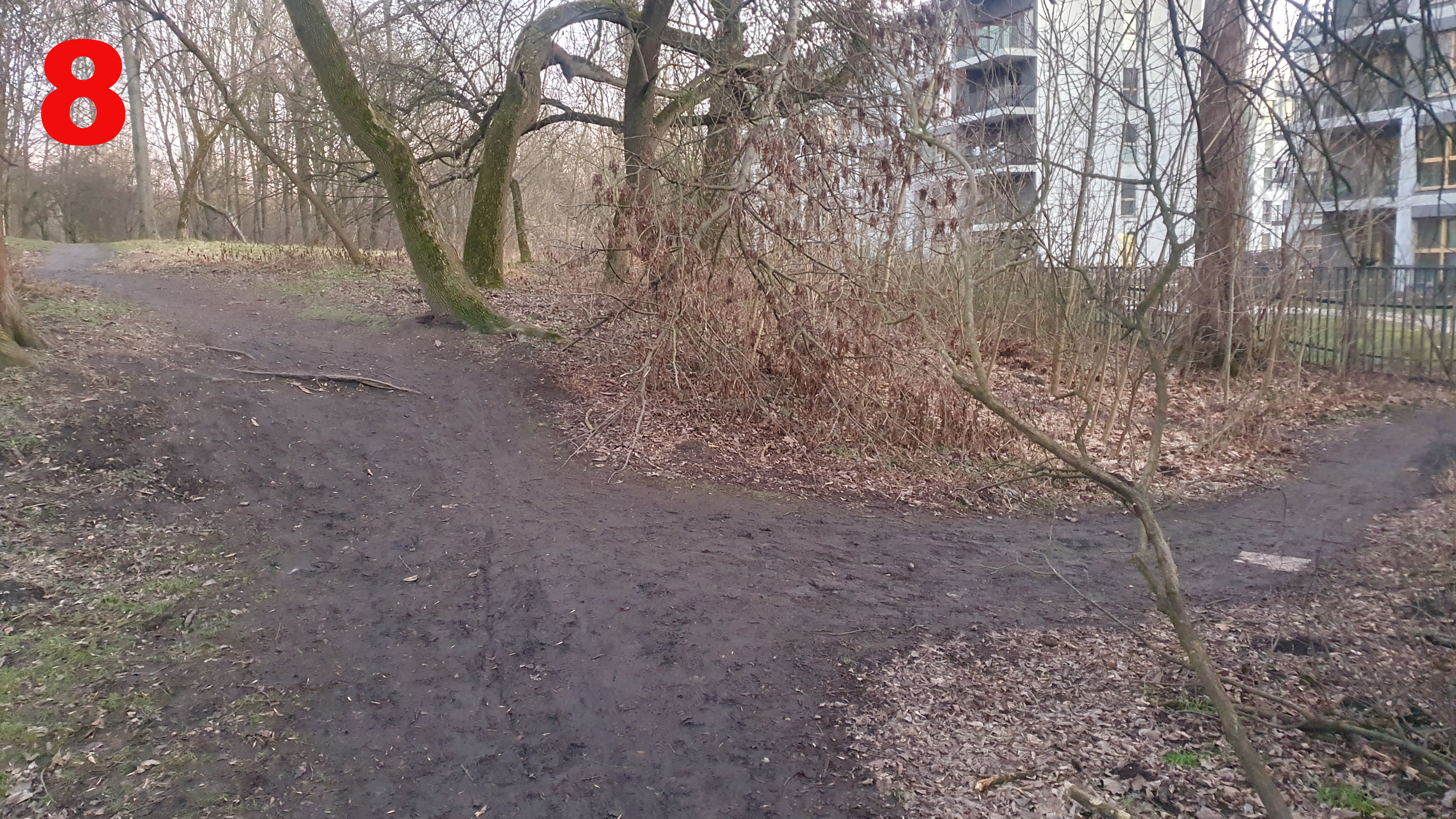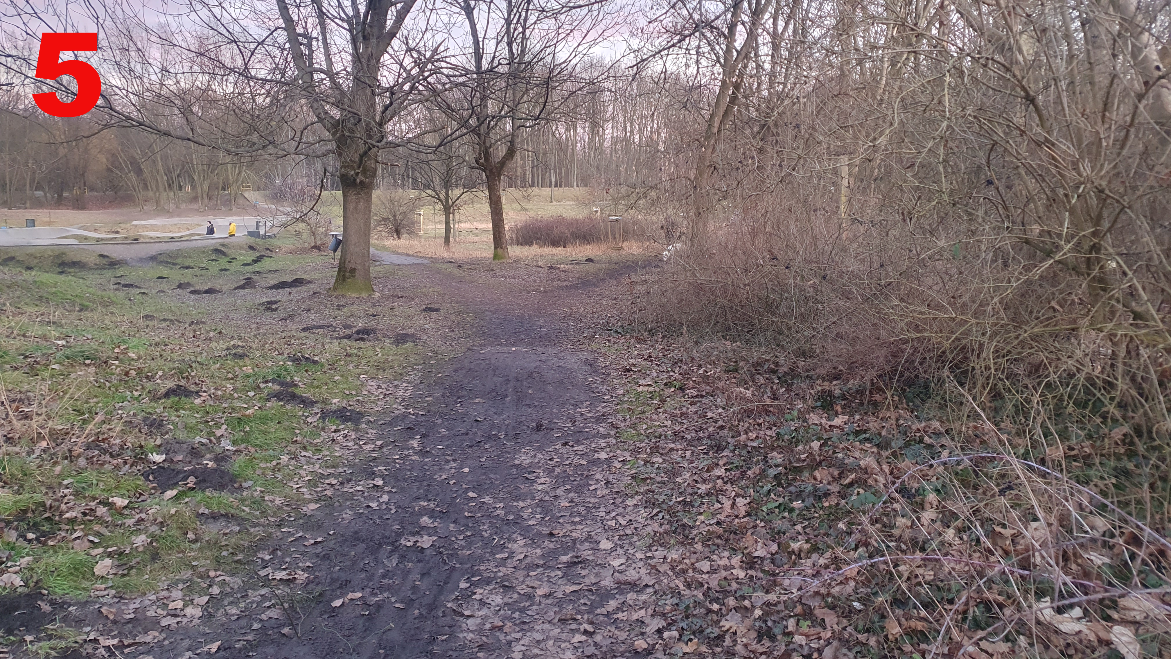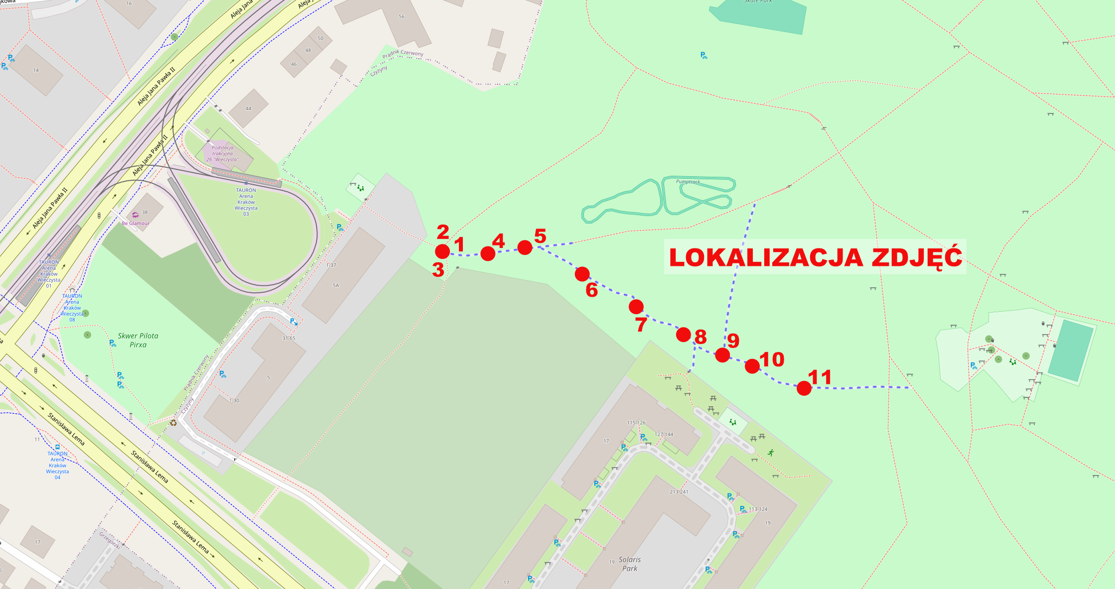 Od dużego placu zabaw, wzdłuż ogrodzenia posesji Lema 17-19 (z odnogami do pumptracku i schodów), wzdłuż granicy działek 1/276, 1/259, 1/255, 1/252, aż do połączenia z istniejącą infrastrukturą przy drugim końcu pumptracku, ul. Lema i al. Jana Pawła II.