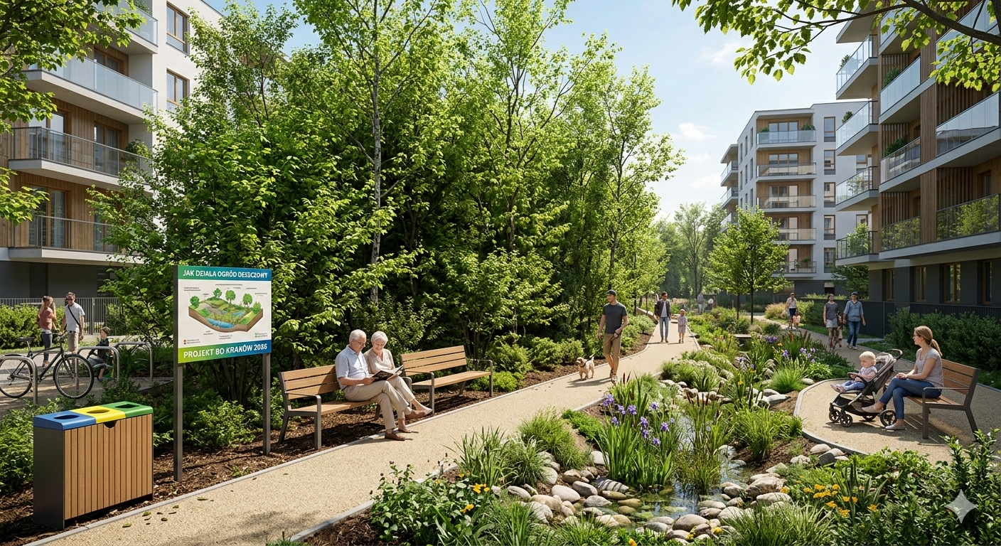 - Likwidację podtopień: Naturalna retencja odciąży kanalizację i osuszy chodniki po deszczu.
