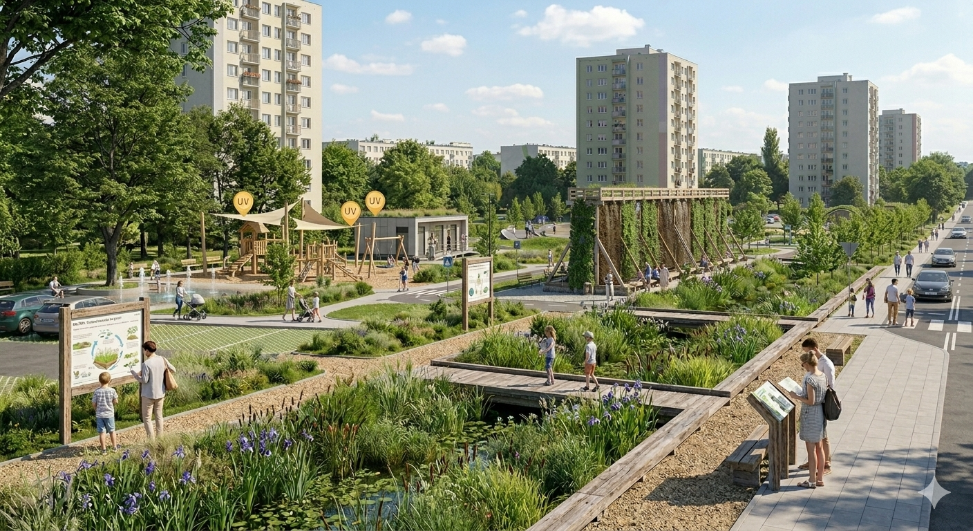 Podsumowanie Koncepcji: Projekt nie jest jedynie estetycznym liftingiem nieużytku. To inwestycja w bezpieczeństwo hydrologiczne Ruczaju i tworzenie korytarza ekologicznego, który obniża temperaturę otoczenia, zwiększa wilgotność powietrza i buduje nową jakość życia w cieniu wielkopłytowej zabudowy. To nowoczesny park, który pracuje dla mieszkańców 24 godziny na dobę, retencjonując wodę i chroniąc przyrodę.