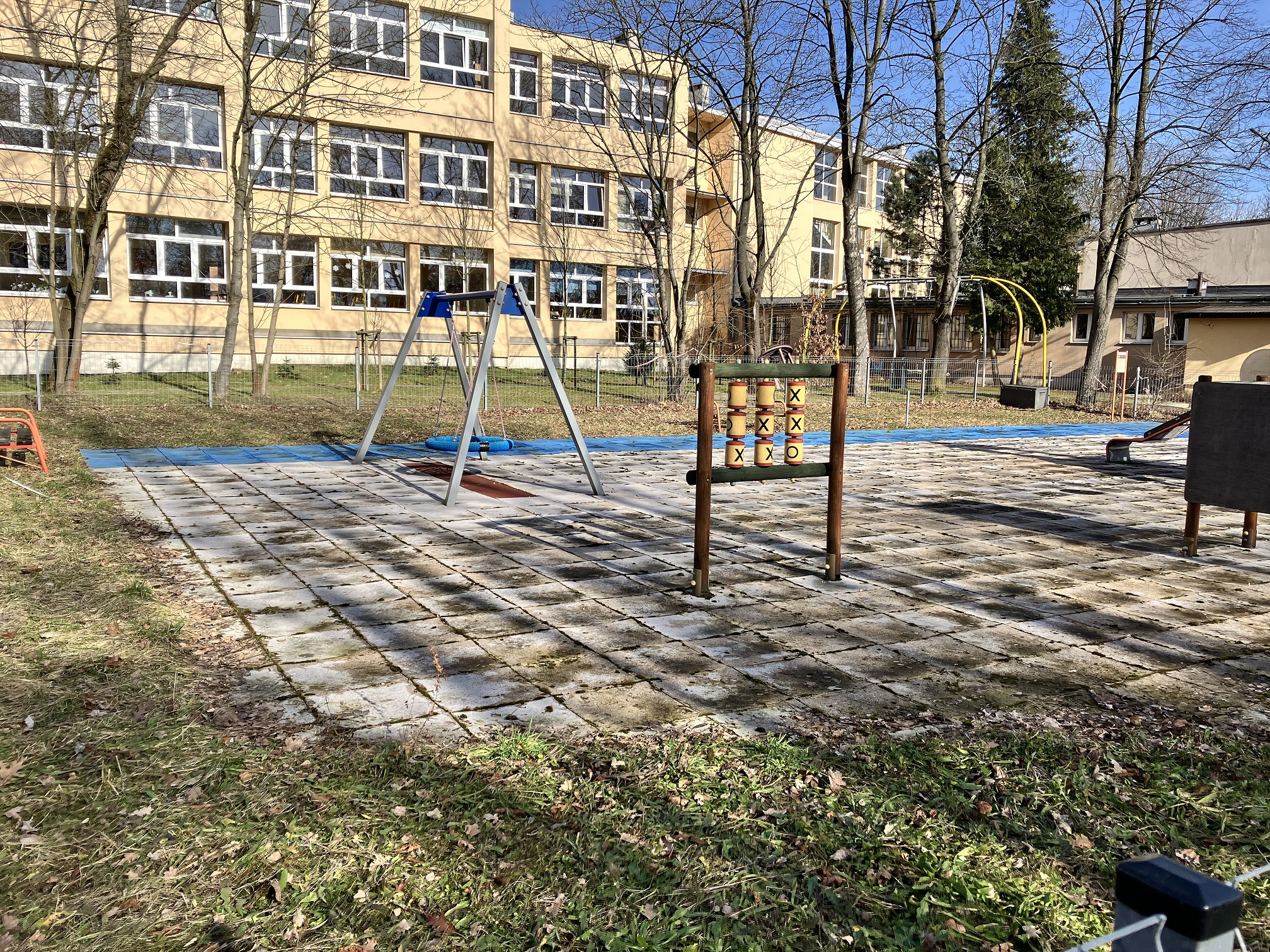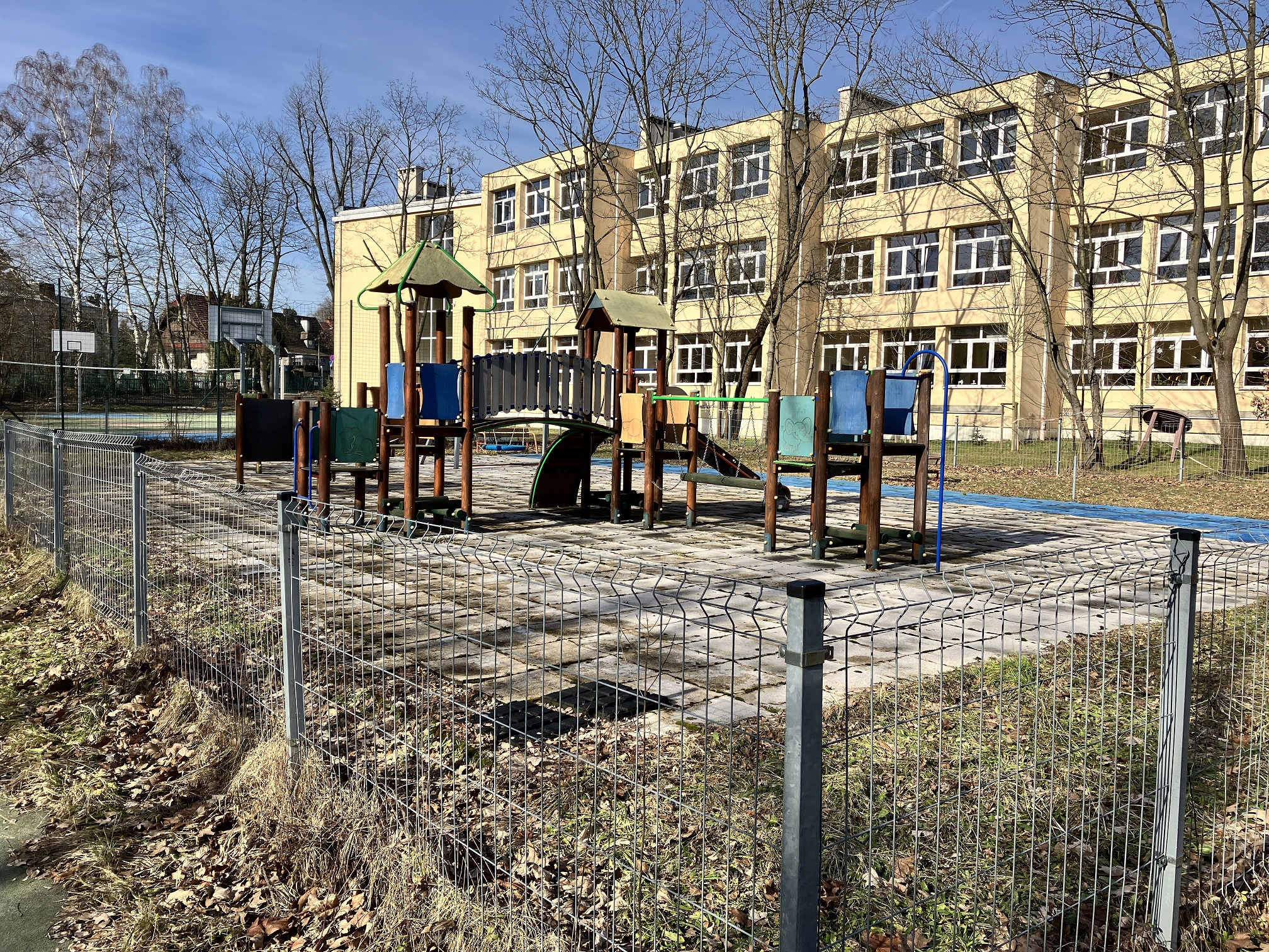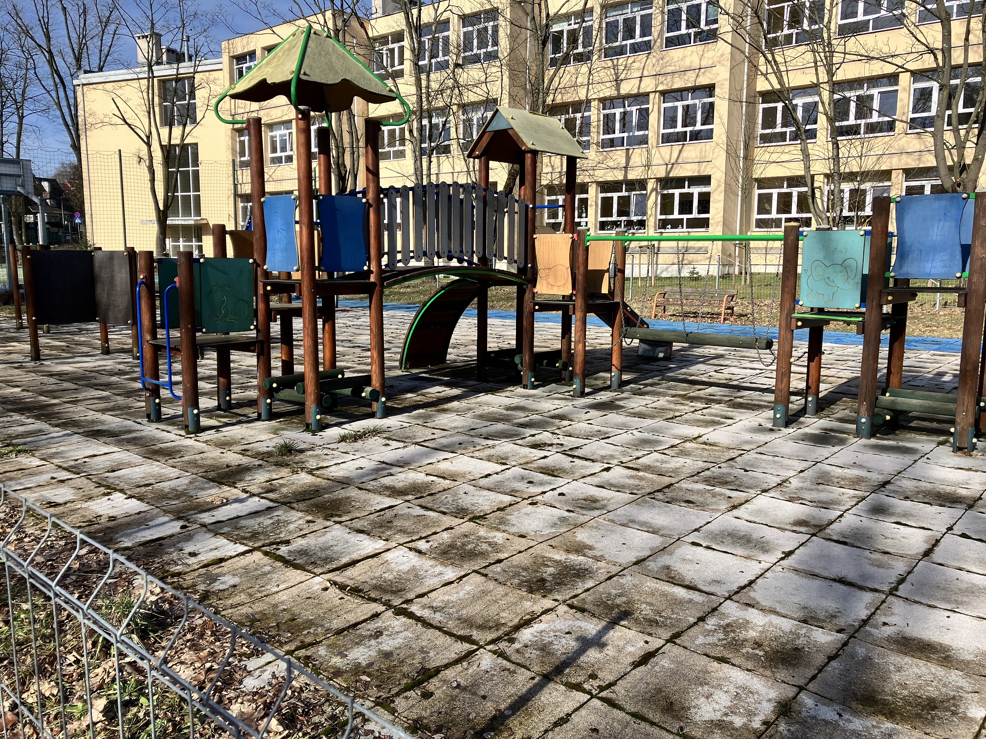 Wymiary placu zabaw to 21x14 m. Był on wykonywany z projektu wesoła szkoła. Po tym jak nawierzchnia pod wpływem warunków