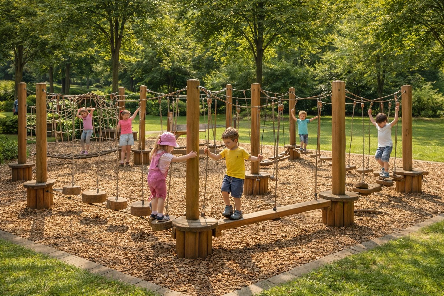 Elementy niskiego parku linowego (mostki, drabinki, równoważnie, huśtawki linowe), Słupy i konstrukcje montażowe wykonane z drewna lub materiałów bezpiecznych dla dzieci, Nawierzchnia amortyzująca w miejscach upadku (piasek lub miękka mata), Ławki dla opiekunów i tablica informacyjna z zasadami korzystania