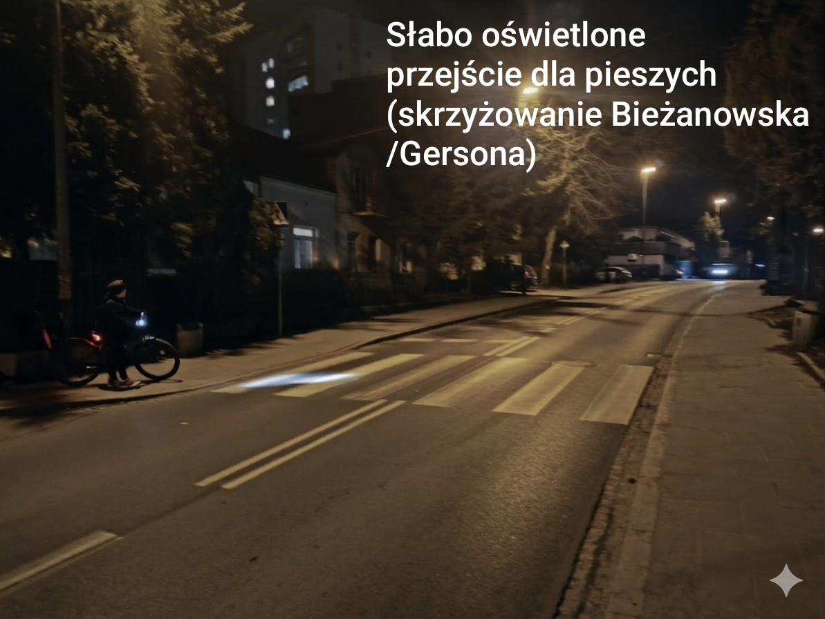 - Spójność infrastruktury: Skuteczność takiego rozwiązania została już potwierdzona na pobliskim skrzyżowaniu ul. Bieżanowskiej z ul. Prostą. Tamtejsze oświetlenie znacząco poprawiło komfort i pewność zarówno pieszych, jak i kierowców. Ujednolicenie standardu bezpieczeństwa na całej długości ul. Bieżanowskiej jest logicznym i pożądanym krokiem.
