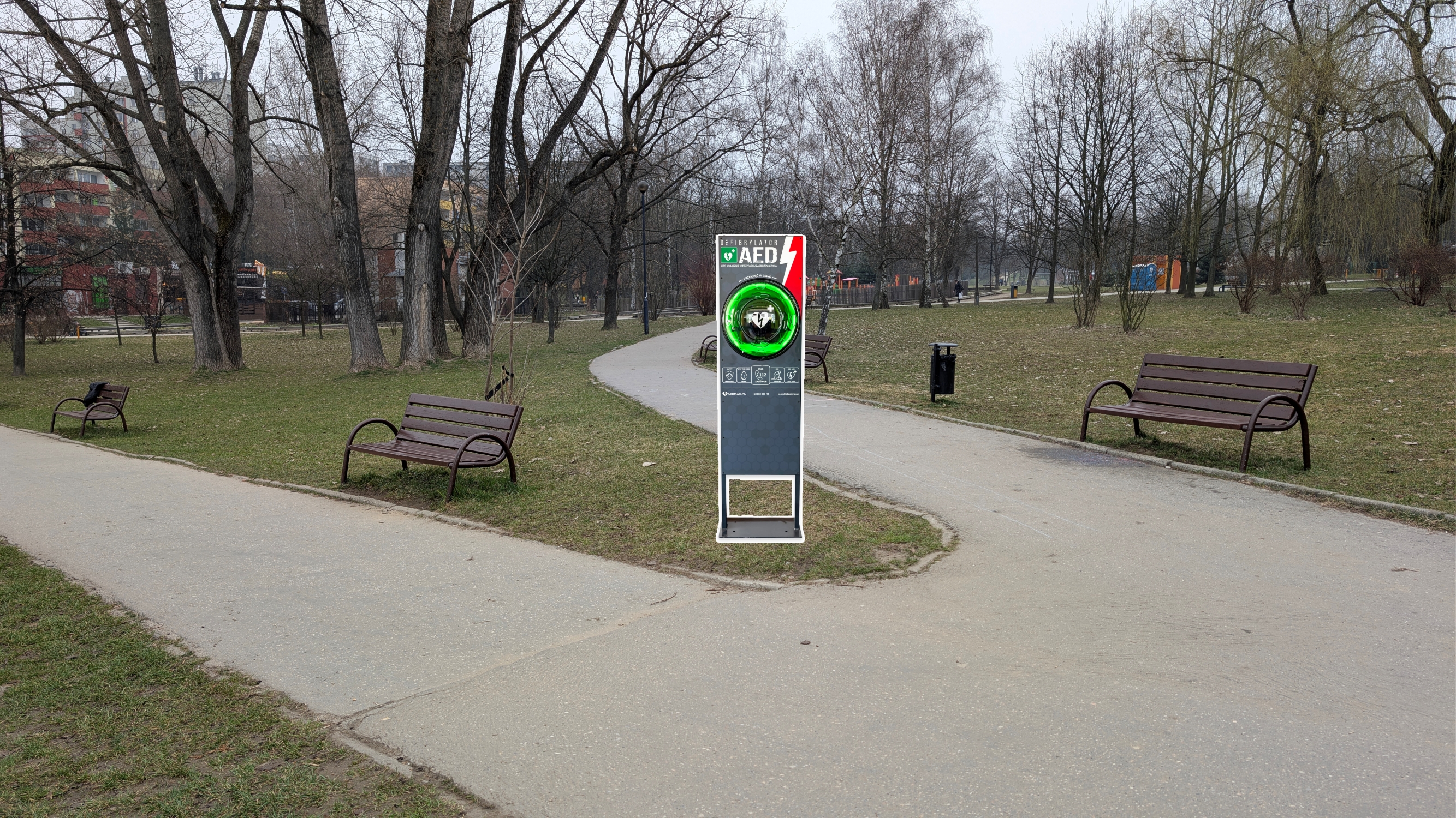 Bezpieczne Serce Kurdwanowa - Defibrylator AED w parku.