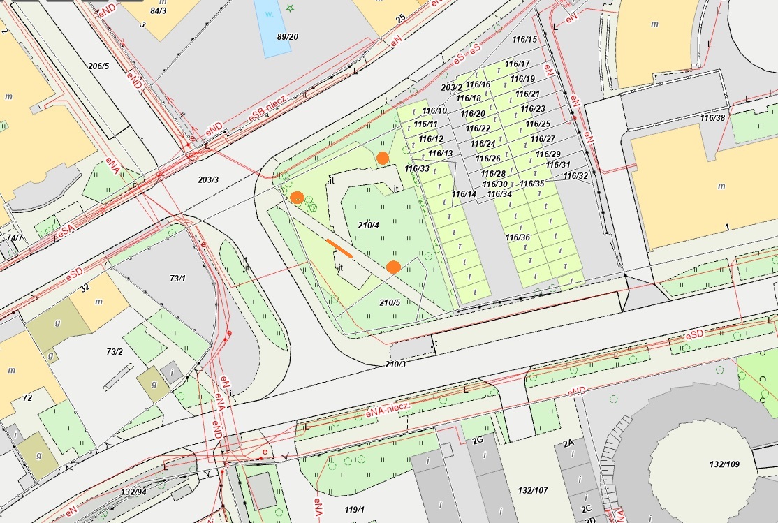 Projektuje się umieszczenie niskich latarni o wysokości 3-4m na dz.210/4 obr.11 Podgórze. Do realizacji inwestycji konieczne będzie wejście w teren działek sąsiednich w zależności od wydanych warunków wskazujących miejsce wypięcia się do sieci, przy czym przedmiotowa działka znajduje się w otoczeniu nieruchomości stanowiących własność miasta więc nie powinno być problemów z realizacją zadania.