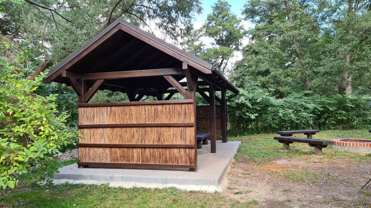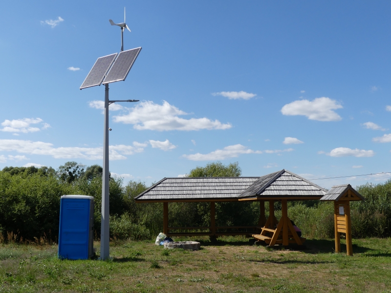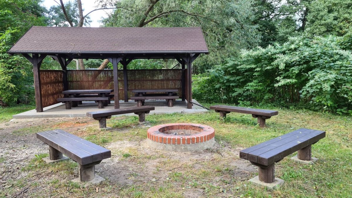 - Bezpieczne miejsce do zatrzymania, odpoczynku i schronienia wiata/zadaszenie chroniące przed deszczem i wiatrem, ławostoły piknikowe + dodatkowe ławki, kosze na odpady (z naciskiem na czystość rzeki i brzegów).