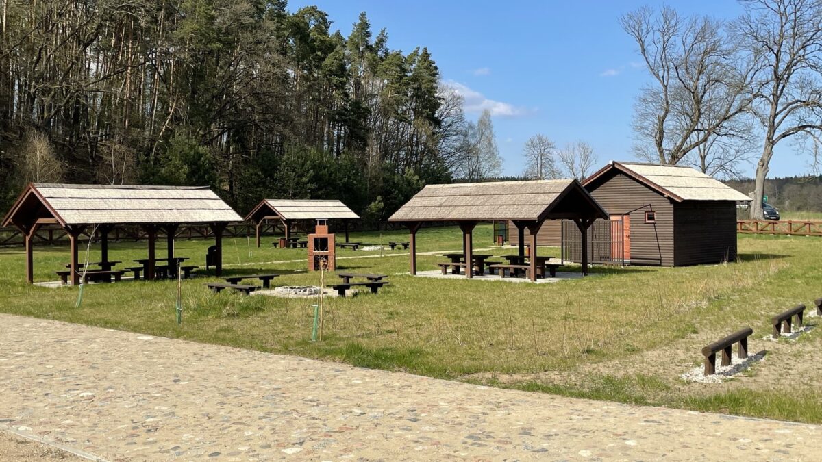 wiata/zadaszenie turystyczne, ławostoły piknikowe, ławki z oparciem, kosze na odpady, stojaki rowerowe, tablica informacyjna (mapa + regulamin + zasady bezpieczeństwa), oznakowanie kierunkowe, toaleta przenośna w sezonie (wakacje).