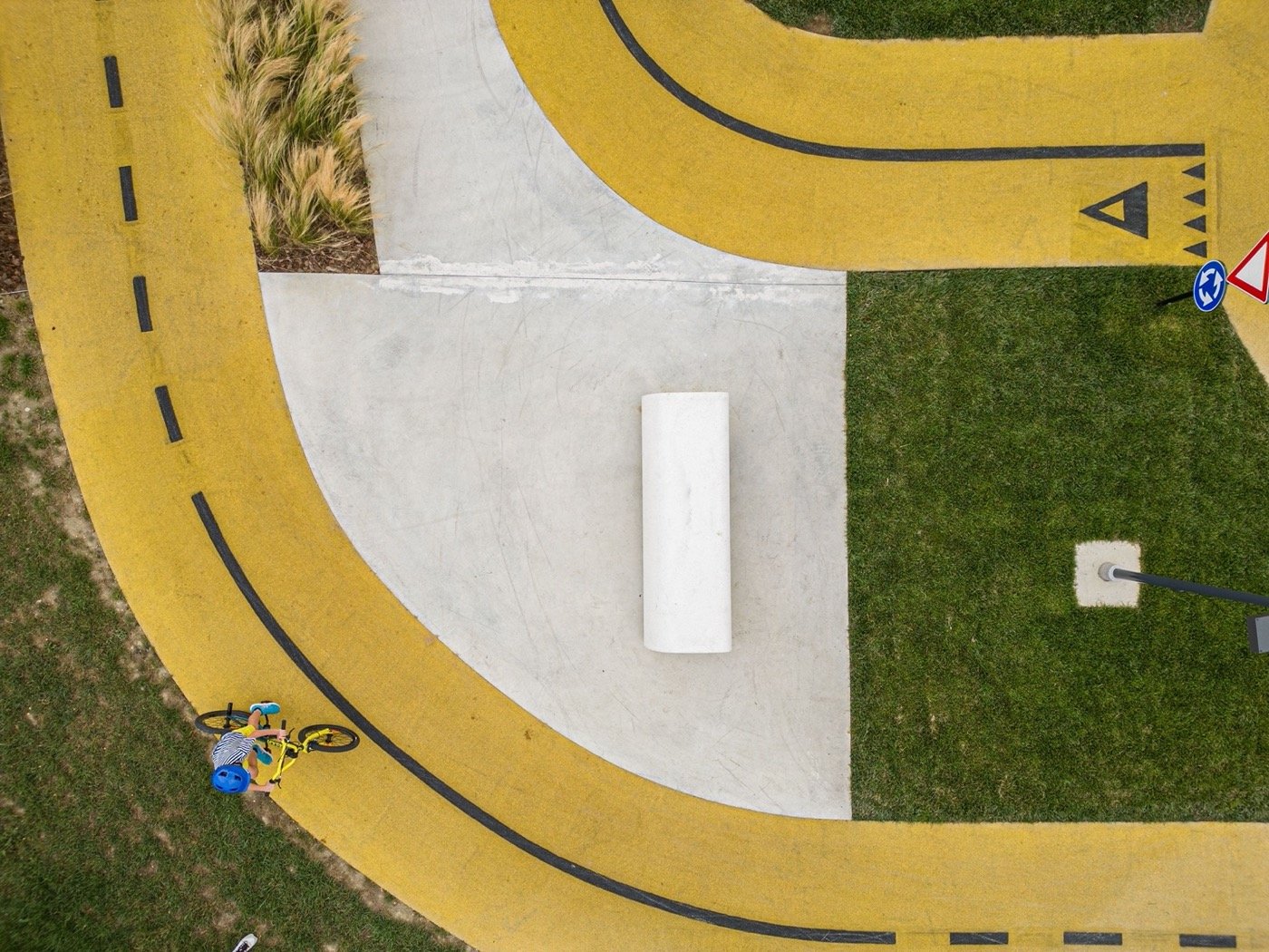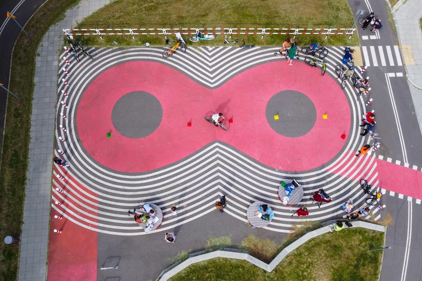 - Miejsce przecięcia się ruchu pieszego i rowerowego, zaprojektowane na wzór wjazdu na Kładkę Ojca Bernatka, uczące wzajemnego szacunku i zasad pierwszeństwa między różnymi użytkownikami drogi.