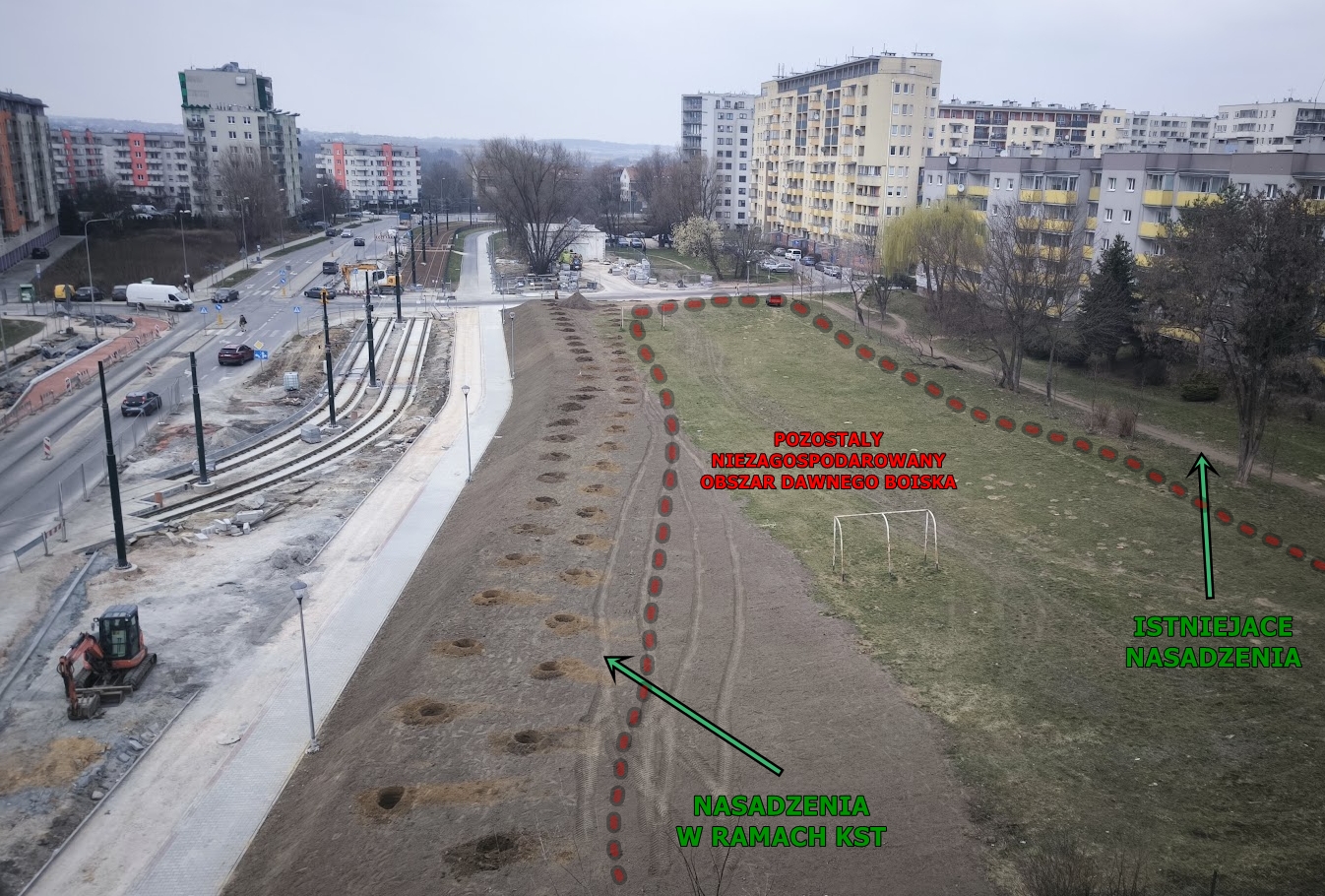 Projekt ma również istotny wymiar środowiskowy i społeczny. Nasadzenia drzew i krzewów zwiększą ilość zieleni w dzielnicy, poprawią mikroklimat oraz pomogą ograniczyć hałas pochodzący z ul. Bohomolca i nowej linii tramwajowej KST IV. Zieleń w naturalny sposób poprawi komfort życia mieszkańców oraz estetykę przestrzeni publicznej.