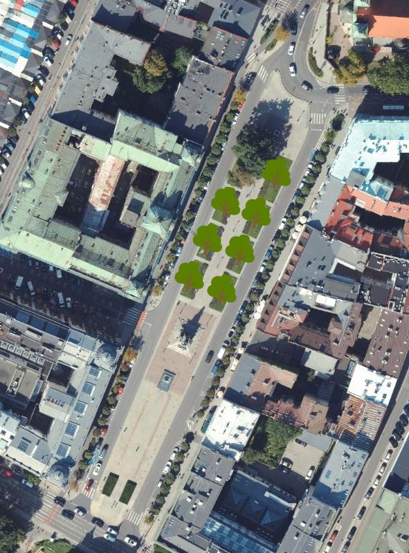 Drzewa zostaną posadzone na Małym Rynku, pl. Szczepańskim, pl. Matejki, i pl. Studzińskiego. Nasadzenia zapewnią trochę cienia i sprawią, że w ciepłe dni miejsca nie będą się już nagrzewać jak piekarnik. Potrzeba więcej zieleni zamiast betonu!