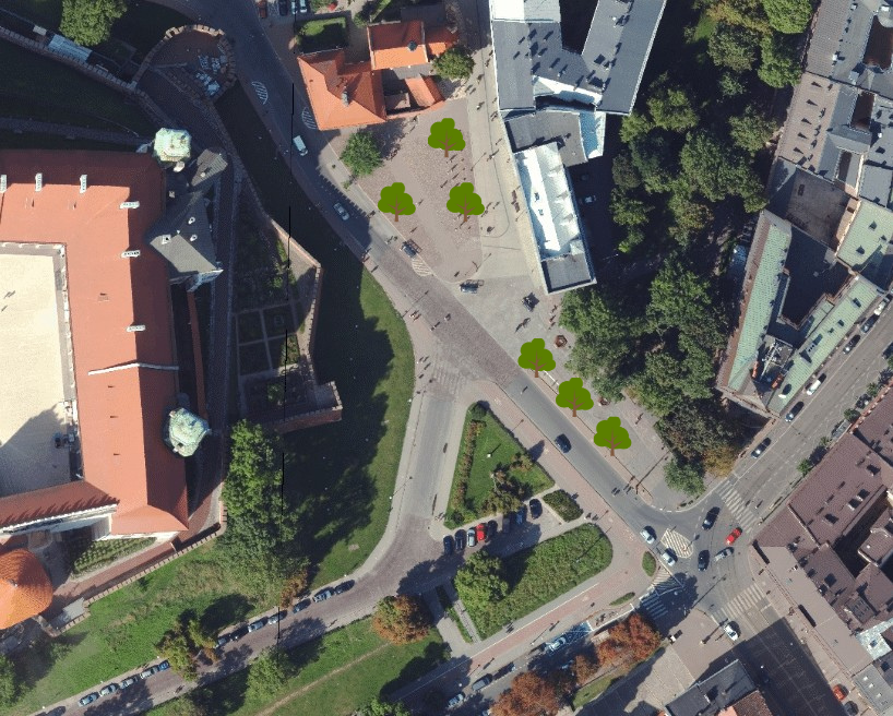 Na centralnej wyspie placu rosną teraz tylko dwa drzewa. Kompozycja zupełnie nie pasuje do układu zieleńców, które są symetryczne. Dlatego w ramach projektu zostałyby dosadzone drzewa w już istniejących okienkach. Dzięki temu zieleń dobrze współgrałaby z układem urbanistycznym placu, a drzewa lepiej wyglądałyby niż spalone słońcem same rabaty, które w okresie letnim podczas suszy często stają się klepowiskiem. Warto podkreślić, że nasadzenia zostaną wykonane w części placu znajdującej się za Pomnikiem Grunwaldzkim, gdzie nie odbywają się uroczystości państwowe. Dlatego dodatkowe rośliny nie będą przeszkadzać w rozstawianiu namiotów podczas ważnych ceremonii, a większa ilość zieleni może mieć pozytywny wpływ na otoczenie podczas upałów .