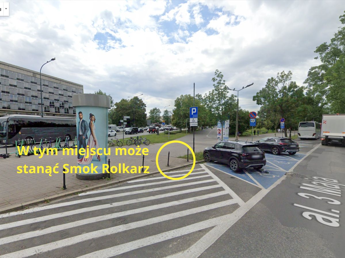 Główna lokalizacja: Chodnik u zbiegu al. 3 Maja oraz al. Focha, na działce nr 208/16 obr. 12 Krowodrza (rejon Błoń).