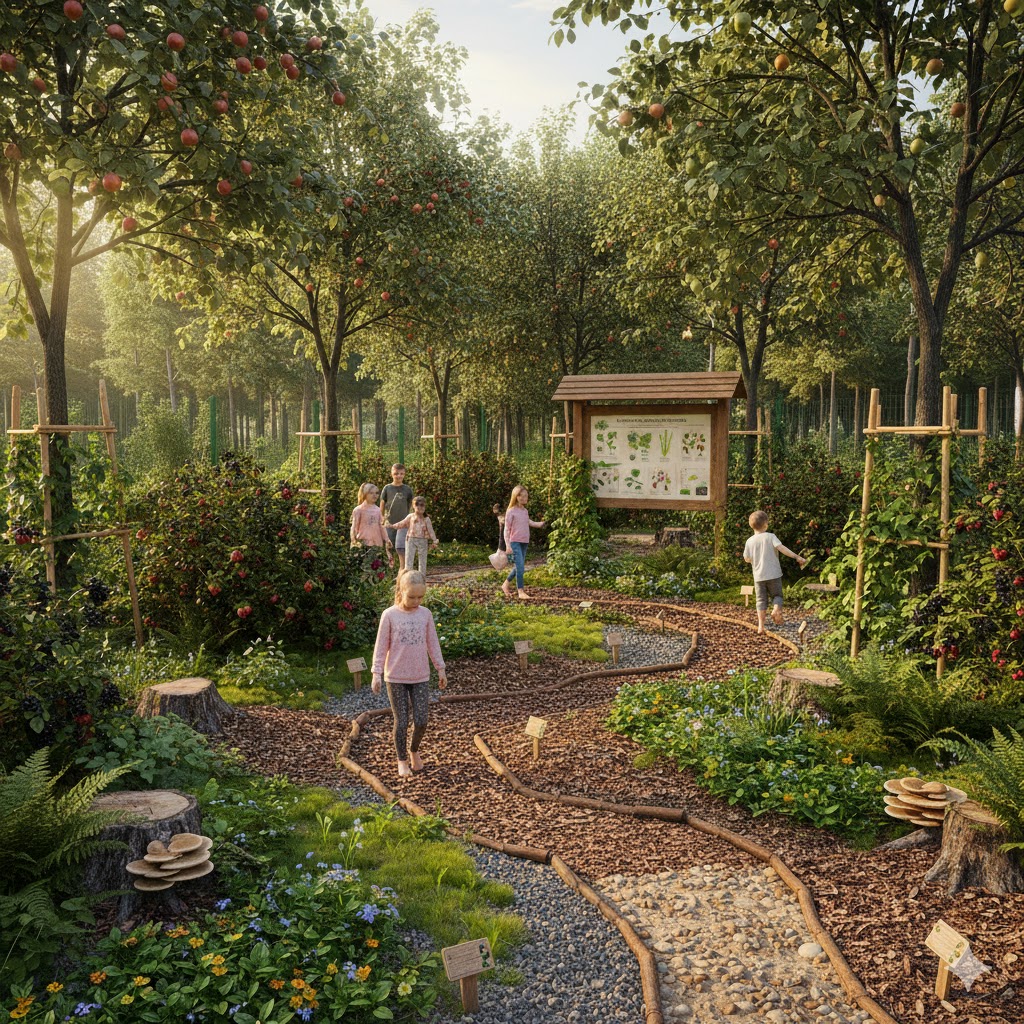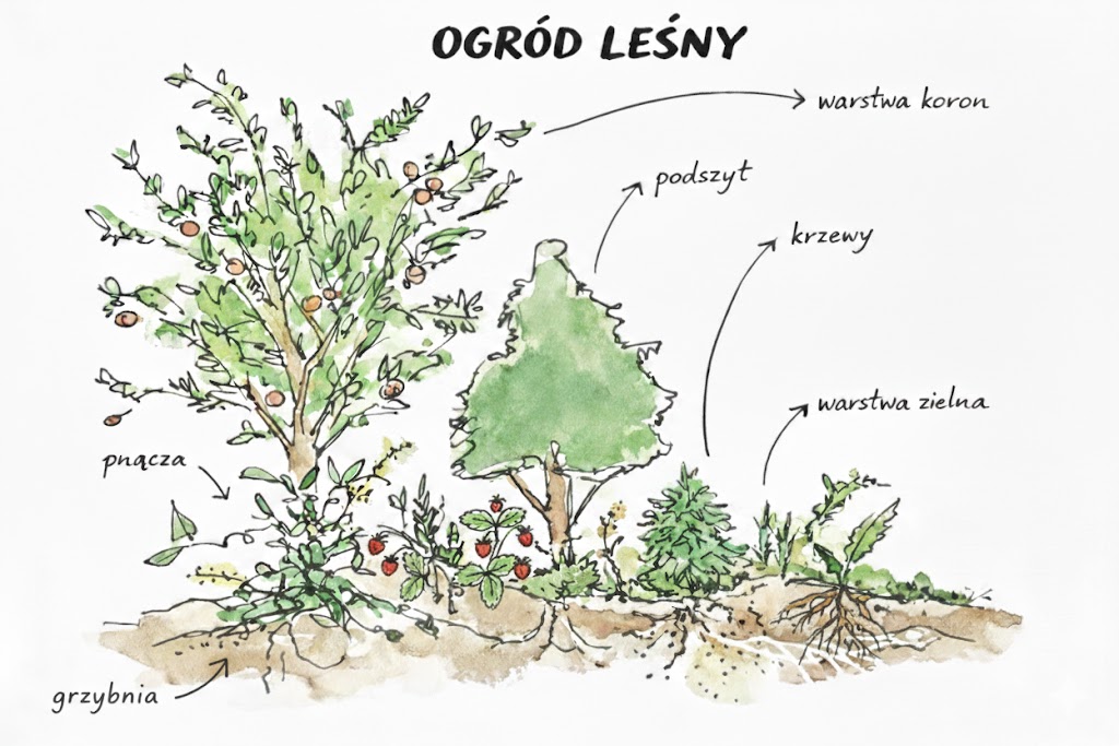 Ogród leśny będzie składał się z kilku warstw roślinności: drzew owocowych, krzewów, roślin zielnych, roślin okrywowych oraz roślin korzeniowych. Tak zaprojektowany system tworzy stabilne środowisko, które wspiera retencję wody, poprawia jakość gleby oraz zwiększa odporność na suszę.