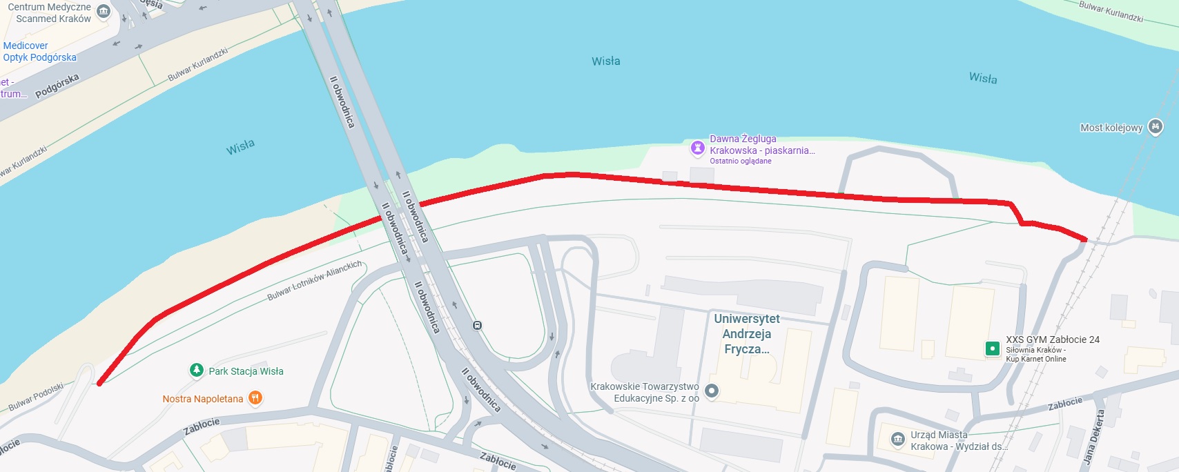 Dodatkowe lokalizacje: Istniejąca ścieżka pieszo-rowerowa nad Wisłą, zaczynając od tyłu osiedla na ul. Zabłocie 24, wzdłuż Wisły koło Żeglugi Krakowskiej, pod mostem Kotlarskim, dołem Bulwaru Lotników Alianckich aż do połączenia ze ścieżką rowerową na Bulwarze Podolskim.